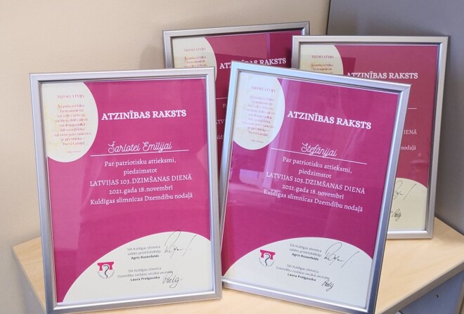 Māmiņas tika sveiktas ar ziediem, bet meitiņas ieguva Kuldīgas slimnīcas atzinības rakstu par patriotisku attieksmi, piedzimstot Latvijas 103. dzimšanas dienā.