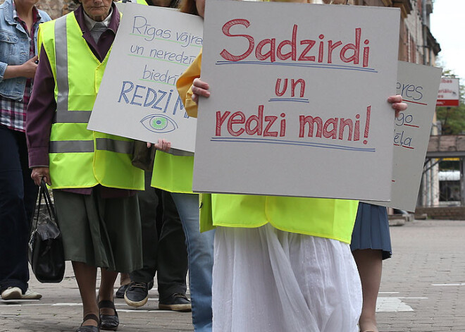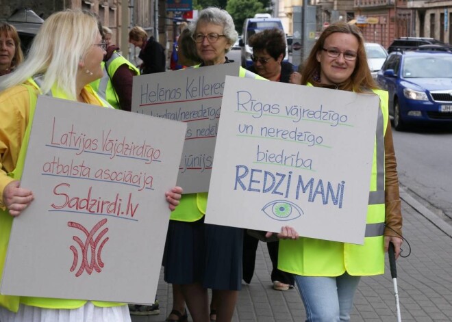 Šodien vājredzīgo un neredzīgo biedrības "Redzi mani" gājienā pulcējās astoņi cilvēki atstarojošajās vestēs, lai pievērstu uzmanību tam, ka sabiedrībā dzīvo cilvēki gan ar redzes, gan dzirdes problēmām.