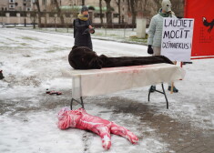 FOTO: dzīvnieku aizstāvji ar vizuālu performanci aicina deputātus aizliegt kažokzvēru audzēšanu Latvijā
