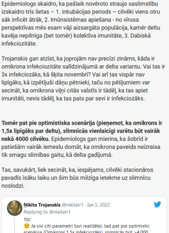 Pirms kāda laika epidemiologs, Nacionālā veselības dienesta (NVD) Vakcinācijas projekta nodaļas speciālists Ņikita Trojanskis izteica prognozes par jaunā Covid-19 varianta omikrona potenciālo ietekmi uz slimnīcu noslogojumu.