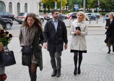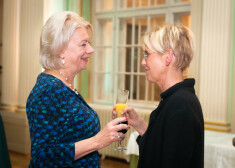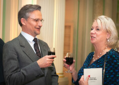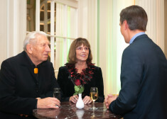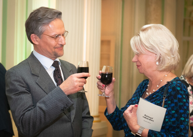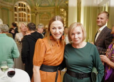 Cilvēki Latvijas Nacionālajā teātrī pulcējas izrādes "Dzimusi vakardien" afterpārtijā