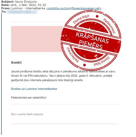 Iedzīvotājiem e-pastos tiek sūtītas krāpnieciskas ziņas "Luminor Latvija" bankas vārdā, aicinot atvērt saiti uz viltus internetbankas lapu. Diemžēl kāds vīrietis šonedēļ bija noticējis, ka vēstuli tik tiešām sūta banka un zaudējis naudu, vēsta Valsts policija.