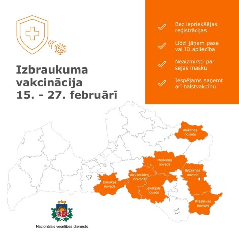 Sadarbībā ar pašvaldībām tiks turpināta izbraukuma vakcinācija apdzīvotās vietās - janvārī tika realizētas 138 izbraukuma vakcinācijas (gandrīz 3000 iedzīvotāju saņema vakcīnas), savukārt februārī kopumā plānotas 31 izbraukuma vakcinācijas.
