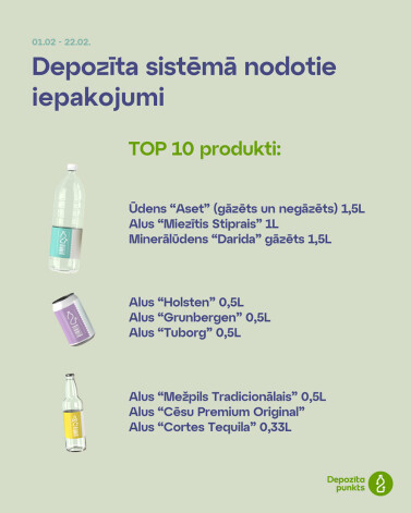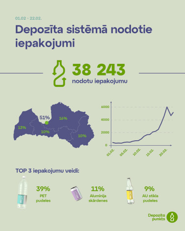 No 1. līdz 22. februārim Latvijas iedzīvotāji depozīta punktos nodevuši kopumā 38 243 tukšos depozīta iepakojumus. Lielākais nodoto iepakojumu apjoms reģistrēts Rīgā, kur iedzīvotāji nodevuši 19 306 iepakojuma vienības, bet zemākais nodoto iepakojumu skaits fiksēts Latgalē (10%) un Zemgalē (10%), kas varētu būt saistīts ar to, ka mazpilsētu un lauku veikalos depozīta produkti tiek piegādāti vēlāk. Dati apliecina, ka lielākā daļa atgriezto iepakojumu ir tie, kas arī pārdošanā nonākuši pirmie.