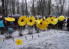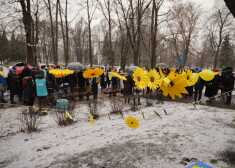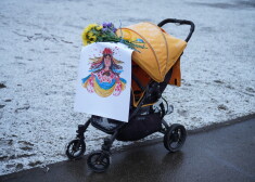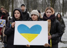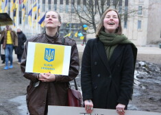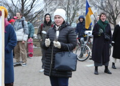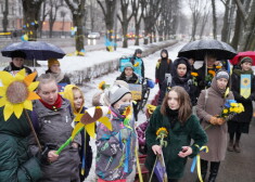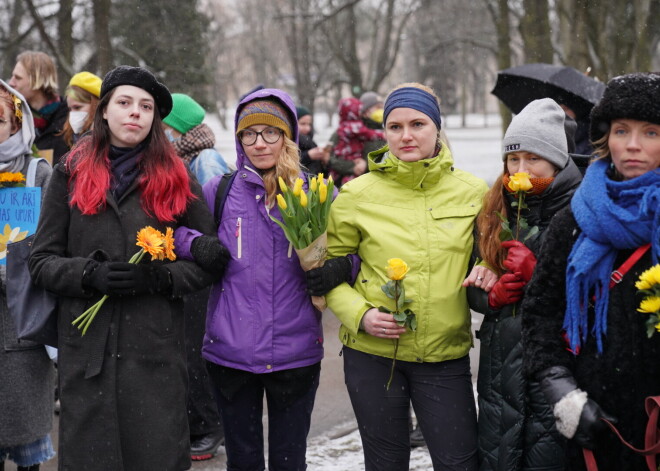 Pie Ukrainas vēstniecības Rīgā ar saulespuķēm atbalsta ukraiņu sievietes