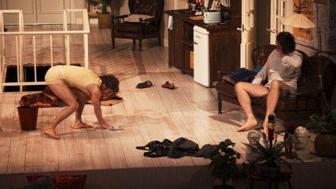 Iestudējuma kopējā noskaņa tomēr ir viegla un atslābinoša. Grūti iedomāties cilvēku, kura lūpu kaktiņi nesavilksies smaidā, redzot Ivara Kļavinska atveidotā Stefana deju vienās apakšbiksēs vai dzirdot Ditas Lūriņas atveidotās Monas lipīgos smieklus.