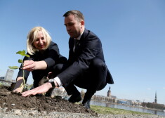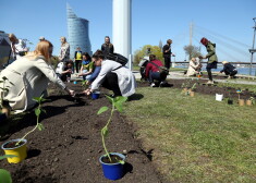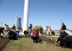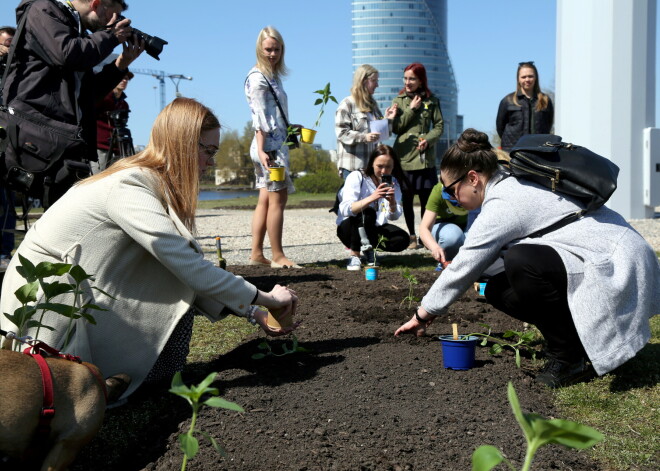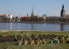 Ar spēka vārdiem Rīgā stāda saulespuķes Ukrainas atbalstam