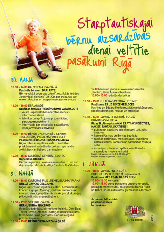 30. maijā bērni kopā ar vecākiem gaidīti Kalnciema kvartālā, festivālā „Dari pats!”, kur varēs piedalīties eksperimentālās darbnīcās, klausīties bērnu vokālās grupas uzstāšanos un noskatīties divas muzikālas izrādes. Šajā dienā pasākums „Sēd uz sliekšņa pasaciņa” ar priekšnesumiem, sportiskām aktivitātēm, radošām darbnīcām notiks arī Bolderājā, Bērnu un jauniešu centra „Bolderāja” pagalmā. Savukārt kultūras centrā „Imanta” koncertā „Lidojums” uzstāsies dziedātāji, dejotāji un soliste Aija Vītoliņa.