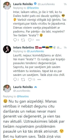 Uz šo Reiniks atbildēja, ka Rešetins ne reizi vien uz skatuves ir “spēlējis līdzīgus tēlus”, bet aktieris aicināja mūziķi nejaukt teātri ar dzīvi: “Laurīti, nejauc komēdijžanru ar dzīvi. Vai mani “krata”? Es runāju par kopējo pasaules tendenci deģenerācijai. Saprotu, ka par savējiem jeb savām vērtībām tu iestāsies, tāpat kā es par savām un savējiem. Tādā ziņā viss chill.”