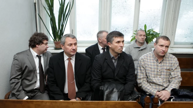Bērnu slimnīcas kukuļošanas lietā apsūdzētie Mihails Kreicers (pa kreisi), Aleksandrs Kreicers, bijušais slimnīcas valdes loceklis, Iepirkumu komisijas vadītājs Arnis Kramzaks, Sergejs Kravcovs, Valsts ugunsdzēsības un glābšanas dienesta inspektors Juris Šmits un Georgijs Pimenovs tiesas priekšā. No cietumsoda viņus paglāba vienošanās ar prokuroru.