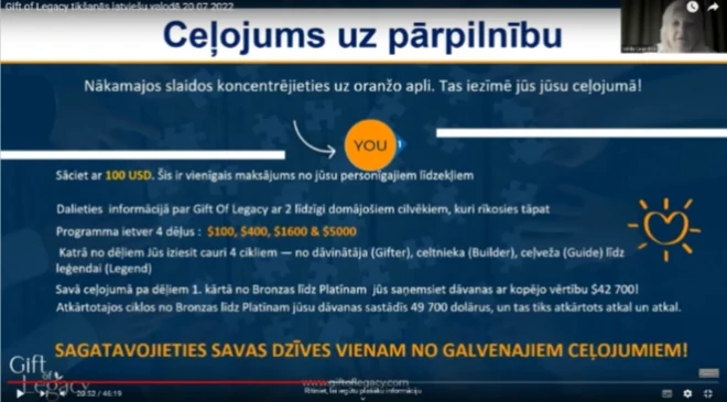 YouTube platformā izplatīts aicinājums iesaistīties piramīdveida shēmā "Gift of Legacy", solot līdz pat 42 700 dolāru lielu peļņu, sākotnēji investējot (dāvinot) 100 dolārus.