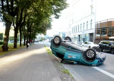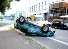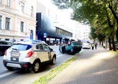 Rīgas centrā piektdien satiksmes negadījuma rezultātā uz jumta apgāzusies automašīna, taču negadījumā nav cietušo.