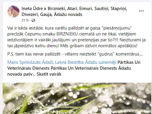 “Vai ir kāda iestāde, kura varētu palīdzēt ar gaisa “piesārņojumu” - precīzāk Cepumu smaku Birznieku ciematā un ne tikai, vietējiem iedzīvotājiem ir vairāki jautājumi un pretenzijas par šo!!! Neizturami ja tas jāpiedzīvo katru dienu! Mēs gribam dzīvot normālos apstākļos!” Ādažnieki steiguši komentēt šo “Facebook” ierakstu: