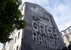 Latviešu ielu mākslinieka Kiwie lielformāta gleznojums "Gray Rainbow" Grīziņkalnā uz Alauksta ielas 13 nama sienas.