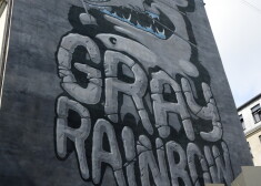 Latviešu ielu mākslinieka Kiwie zīmējums "Gray Rainbow" Grīziņkalnā uz sienas