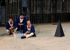 Jaunā Rīgas teātra aktieri filmējas Ullas fon Brandenburgas izstādes „Kalns, grimsti! Ieleja, celies!” perfomencē – filmā.