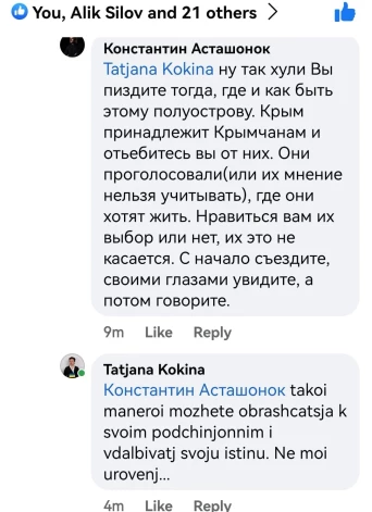 Strīdā, kurš acīmredzami ir par Krimas statusu, Astašonoks, izmantojot krievu rupjības, raksta: “Nu tad h**ļi, jūs d***at kā un kur būt šai pussalai. Krima pieder tās iedzīvotājiem un at*****ies no viņiem [...]”