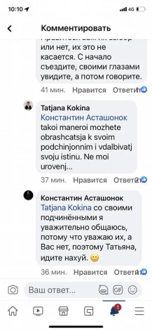 Atbildē sieviete Astašonokam norāda, ka tā viņš varot runāt ar saviem padotajiem, un, ka šis “neesot viņas līmenis”.