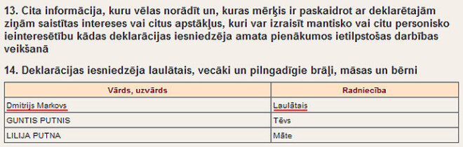 Deklarācijā kā savu laulāto Putnis norādījis Dmitriju Markovu, bet kā tēvu un māti - Gunti un Liliju Putņus.