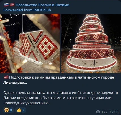 Pagājušās nedēļas izskaņā vairākās Latvijas pilsētās tika iedegtas Ziemassvētku egles. Kamēr vairumam šeit dzīvojošo tie bija priekpilni, sabiedriski notikumi, Krievijas propagandisti Lielvārdes stilizētajā, mākslīgajā skuju kokā saskatīja nacisma atdzimšanu.