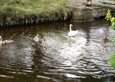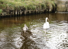 Māras dīķī jaunie gulbēni izmisīgi cenšas tikt pāri kaskādēm