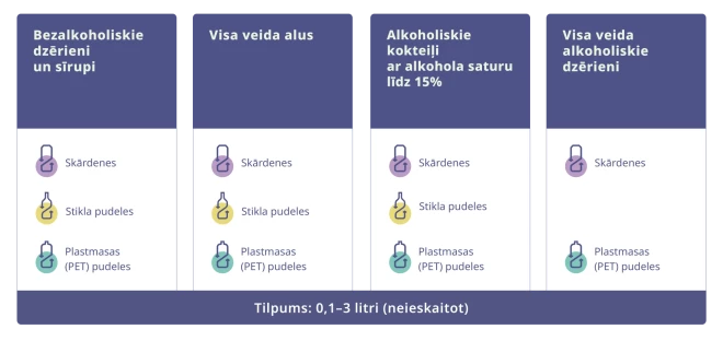 No 2023. gada 1. janvāra depozīta sistēmā var nodot arī sīrupa un alkoholisko kokteiļu, kas veidoti uz spirta bāzes (ar alkohola saturu līdz 15%), stikla, plastmasas (PET) un skārdeņu iepakojumus, kā arī visu veidu alkoholiskos dzērienus PET pudelēs vai skārdenēs, kas ir marķēti ar Latvijas depozīta zīmi, portālu Jauns.lv informē Depozīta Iepakojuma Operators.