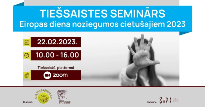 Interesenti aicināti pieteikties tiešsaistes semināram un ekspertu diskusijai “Eiropas diena noziegumos cietušajiem 2023”, kas norisināsies 22. februārī no plkst. 10.00 līdz plkst. 16.00. Uzmanības centrā - pieejamais atbalsts, cietušā izaicinājumi un vajadzības ceļā uz tiesību aizstāvību un sociālo rehabilitāciju, valsts iestāžu un nevalstisko organizāciju loma ceļā uz pilnvērtīgu nozieguma seku novēršanu un preventīvo darbību.