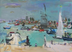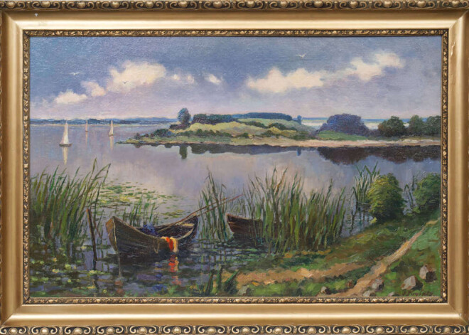 Bet par 2500 eiro šobrīd novērtēta izcilā latviešu gleznotāja Jāņa Pauļuka (1906 - 1984) eļļas tehnikā tapušais mākslas darbs “Regate negaisā” (46,3x39,4 cm). Tāpat 2500 eiro pašreiz sola arī par Valijas Emmas Liepiņas eļļas gleznu “Peldētājas ar bumbu” (170x130 cm).