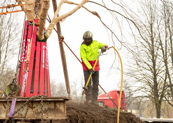 Rīgā, Uzvaras parkā, kur šovasar plānots uzstādīt apmēram 65 metrus augstu panorāmas ratu, notikusi unikāla koku pārstādīšanas operācija – vienlaikus ...