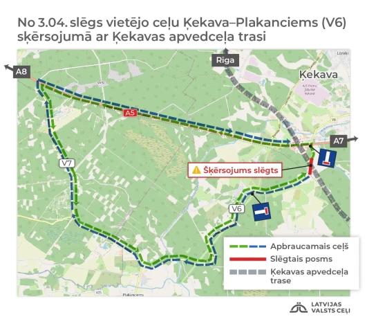 Turpinot Ķekavas apvedceļa būvdarbus, šā gada 3. aprīlī plānots satiksmei slēgt vietējā autoceļa Ķekava–Plakanciems (V6) posmu, kas šķērso topošā Ķekavas apvedceļa trasi. Posms tiek neatgriezeniski slēgts, un turpmāk maršrutam uz Ķekavu jāizvēlas vietējais autoceļš Baloži–Plakanciems–Iecava (V7) un Rīgas apvedceļš (Salaspils-Babīte) (A5) (skat. kartē).