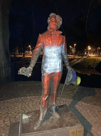 Latvijas un Ukrainas karoga krāsās nokrāsots Puškina piemineklis
