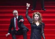 Viestura Kairiša režisētā jauniestudējuma “Hamlets” Mihaila Čehova Rīgas Krievu teātrī apmeklētāji un bankets 2023. gada aprīlī.