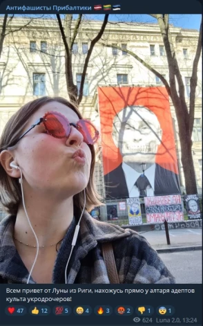 Fotogrāfija, kurā Viktorija Matule it kā pozē pie Krievijas Federācijas vēstniecības Latvijā, ievietota “Baltijas antifašistu” kanālā iekš “Telegram”.