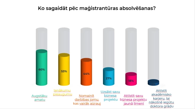 Pēc absolvēšanas vairākums sagaida augstāku amatu (60%) un ienākumu pieaugumu (53%). Gandrīz puse (44%) studentu cer pēc diploma saņemšanas nomainīt darbības jomu uz to, kas viņus vairāk aizrauj. Daļai aptaujāto cerības saistītas ar uzņēmējdarbību: 27% vēlas uzsākt savu biznesa projektu un 18% – attīstīt savu biznesa projektu jaunā līmenī. Bija arī respondenti, kuri cer attīstīt akadēmisko karjeru un norādīja, ka maģistra grāds ir nepieciešams, lai nākotnē iegūtu doktora grādu. Pie atziņām, ko studenti jau ir ieguvuši studiju laikā, atgriezīsimies nedaudz vēlāk. Tikmēr apskatīsimies, ko liecina dati par maģistru ienākumiem un nodarbinātību.