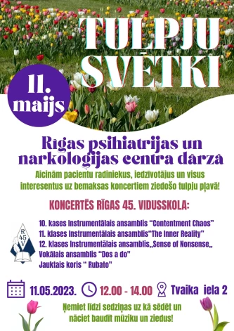 Lai pavasara svinēšanu un tulpju ziedēšanu padarītu vēl skaistāku un īpašāku, RPNC aicina visus uz “Tulpju svētku” pusdienlaika koncertu Rīgas psihiatrijas un narkoloģijas centra dārzā, kas notiks ceturtdien, 11. maijā no plkst. 12.00 – 14.00.