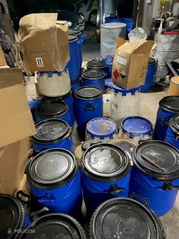 Jāpiemin, ka ražotne bija maskēta, proti, ierīkota atsevišķā telpā, kur nebija piekļuve autoservisa apmeklētājiem. Kratīšanas laikā policisti izņēma vairāk nekā 100 tvertņu ar ķīmiskām vielām, kas paredzētas narkotisko un psihotropo vielu izgatavošanai. Kopumā tika konstatēts un atsavināts ap vienu tonnu kristāliskas vielas. Veicot primāro narkotisko vielu ekspertīzi, paraugos tika konstatēts izometadona un metadona starpprodukts. Tāpat tika atsavināti 2 500 litru šķidra veida ķimikāliju. Jāpiemin, ka precīzs izņemto vielu daudzums un sastāvs būs zināms tikai pēc pilnas ekspertīzes rezultātu saņemšanas. Tāpat policisti izņēma ražošanas aprīkojumu, tostarp dažādas kolbas, dzesēšanas aparātu u.c.