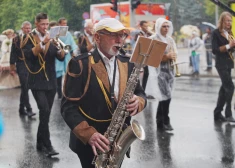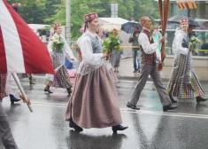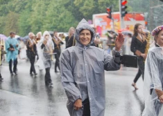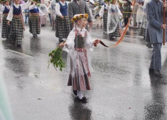 Dziesmu un deju svētku gājiena dalībnieki piedzīvo lietu