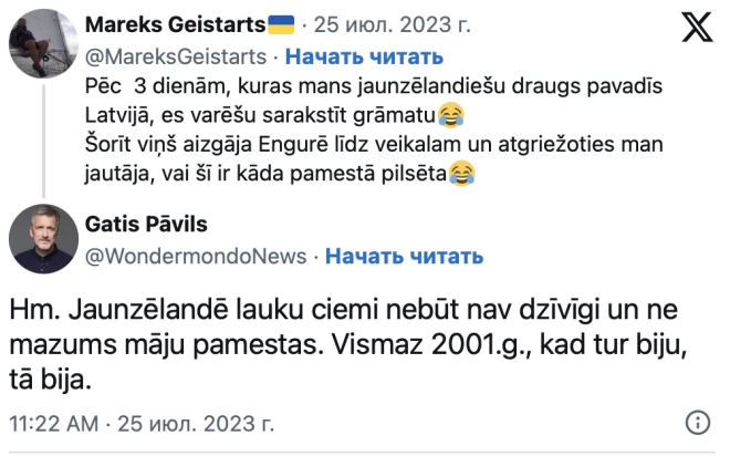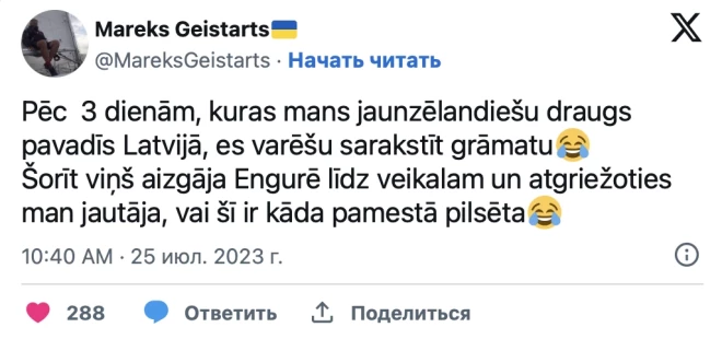 Šādi gadījies vīrietim no Jaunzēlandes. Viņš atbrauca ciemos uz Latviju pie sava drauga un šeit uzturējās tikai trīs dienas. Par to savā tviterī rakstīja Mareks Geistarts - jaunzēlandieša draugs: "Pēc trim dienām, ko mans jaunzēlandiešu draugs pavadījis Latvijā, es varu uzrakstīt grāmatu. Šorīt viņš, atgriezies Engurē, aizgāja līdz veikalam un man jautāja, vai tā nav pamesta pilsēta."