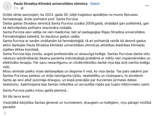"Dziļās sērās paziņojam, ka 2023. gada 30. jūlijā traģiskos apstākļos no mums šķīrusies farmakoloģe, ārste-psihiatre prof. Santa Purviņa."