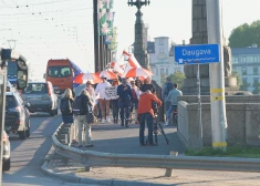 Pasākumu uzmana neliels skaits policistu, kas nepieciešamības gadījumā uz bīdi slēdz satiksmi, kad gājiena dalībnieki šķērso ielas.