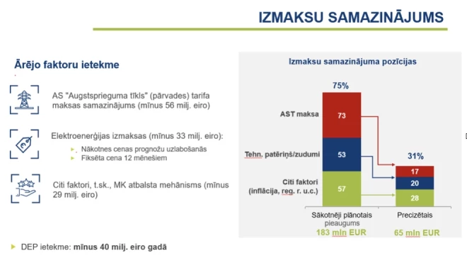 Sākotnējā tarifa projektā tie sastādīja 53 miljonus eiro, bet esošajā vairs tikai 20 miljoni eiro. Tāpat arī ar pārējām izdevumu pozīcijām (kā piemēram AST tarifu). Līdz ar to radās iespēja samazināt tarifa pieaugumu par 118 miljoniem eiro! Rezultātā kopējais izmaksu pieaugums 183 miljonu eiro vietā sastādīja vien 65 miljonus eiro.