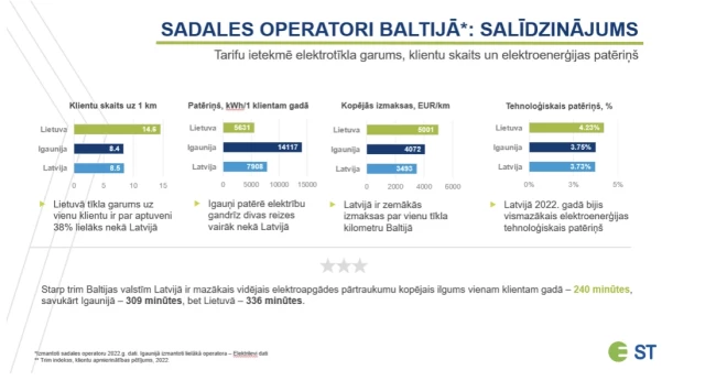 Taču neskatoties uz to mūsu tīkla operatora izmaksas uz vienu tīkla kilometru ir zemākas nekā kaimiņiem. Tāpat arī citos daudz maz objektīvi salīdzināmos operatora darbības parametri – kā piemēram, vidējais tīkla bojājuma novēršanas laiks, tīkla zudumi, mikroģenerācijas pieslēgšanas laiks, uc. - mūsu operatoram ir labāki nekā kaimiņiem.