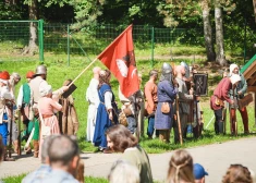 Bruņinieki cilā zobenus Zemgaļu svētkos Tērvetē