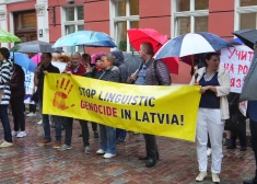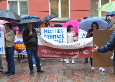 Spītējot lietum, šodien ap 30 cilvēki bija pulcējušies uz piketu pret pāreju uz mācībām tikai latviešu valodā Latvijas skolās.