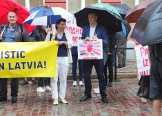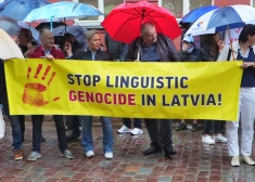 VIDEO: spītējot lietum, pārdesmit krievu skolu aizstāvji pulcējas pie Saeimas