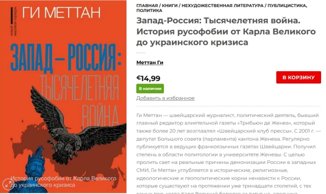SIA "Kniga lv" interneta veikalā nopirkšanai izlikta ir, piemēram, autora Gija Metana grāmata "Rietumi-Krievija: rusofobijas tūkstoš gadu vēsture no Kārļa Lielā līdz Ukrainas krīzei".