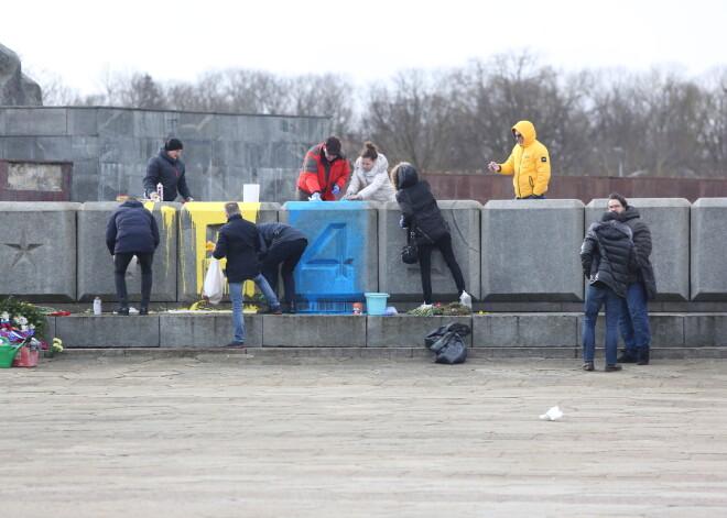 Aktīvisti tīra Uzvaras pieminekli, kurš apliets ar Ukrainas karoga krāsām