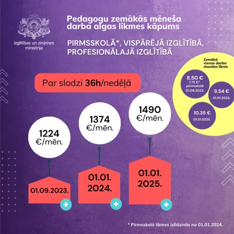 IZM aprēķini liecina, ka pedagogu (pirmsskolā, vispārējā un profesionālajā izglītībā) zemākā mēneša darba algas likme par 30 stundām nedēļā kāps no 1020 eiro šogad līdz 1145 eiro mēsesī nākamgad (2025. gadā tā jau būs 1245 eiro); par 36 stundām nedēļā - no 1224 eiro šogad līdz 1374 eiro nākamgad (2025. gadā tā jau būs 1490 eiro); par 40 stundām nedēļā - no 1360 eiro šogad līdz 1526 eiro nākamgad (2025. gadā tā jau būs 1656 eiro). Tas nozīmē, ka nākamgad skolotājs, kurš strādā 30 stundas nedēļā mēnesī “uz papīra” saņems vismaz par 125 eiro vairāk, savukārt tas, kurš strādā 36 stundas – 150, bet 40 stundas– 166 eiro vairāk. Šogad zemākā darba algas likme pedagogiem ir 8,5 eiro stundā (nākamgad – 9,54, bet aiznākamgad – 10,35 eiro).