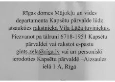 Pie rakstnieka un kolaboranta Viļa Lāča pieminekļa Rīgas Meža kapos jau kādu laiku izlikts paziņojums: “Rīgas domes Mājokļu un vides ...
