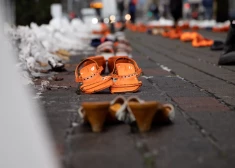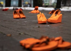 Pie valdības ēkas izlikti oranži kurpju pāri, simbolizējot nogalinātās un no vardarbības cietušās sievietes